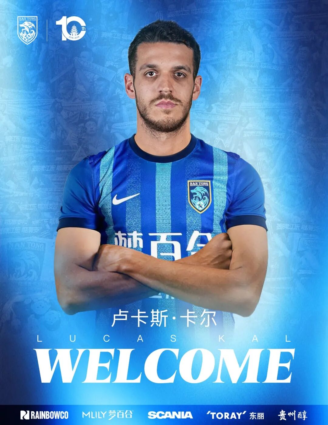 同心致远,共赴荣光!欢迎卢卡斯·卡尔加入支云大家庭,愿你身披蓝色战袍,在绿茵场上挥洒激情、绽放光芒,与全体将士、全城球迷一同为南通而战!