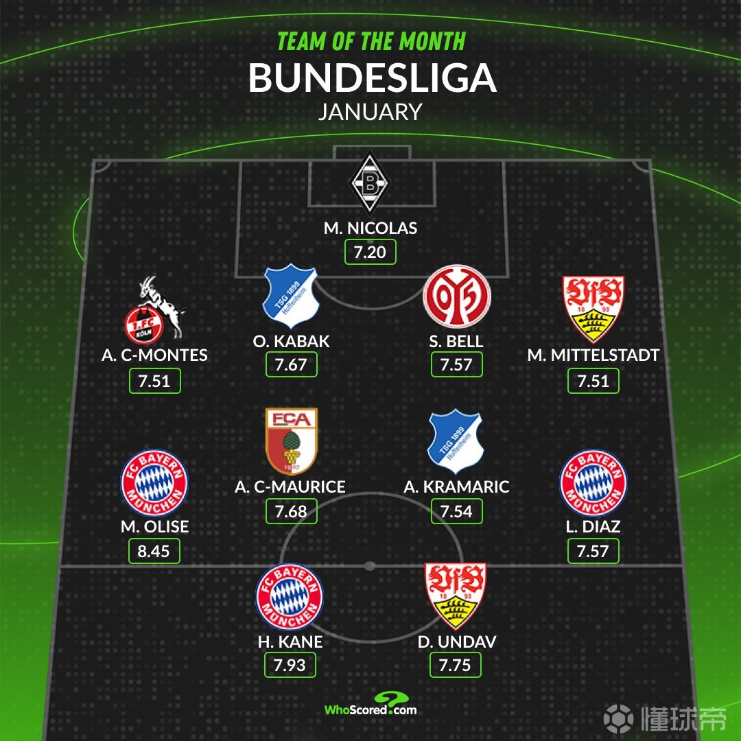 德甲月最佳阵容:凯恩、奥利塞、迪亚斯入选
